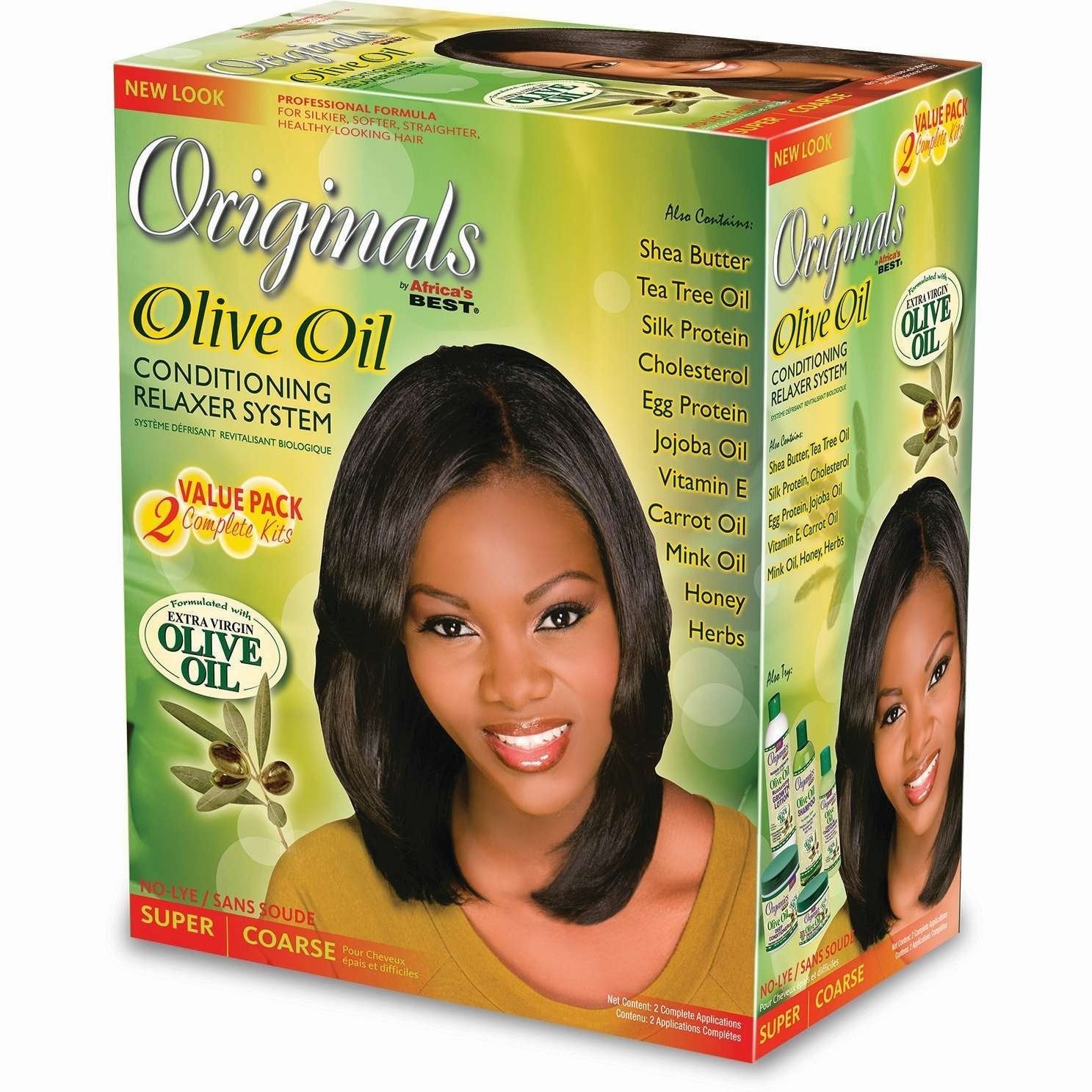 Africas Best Organics Olive Oil Conditioning Relaxer System formulated with Extra Virgin Olive Oil No Lye Super. Organics is the first Organic Conditioning No-Lye Relaxer. This Relaxer is a all-natural conditioner that moisturizers and strengthen hair that is gentle to your SKIN CARE and scalp during the hair treatment relaxing process. It helps to restore silky soft healthy strait hair.